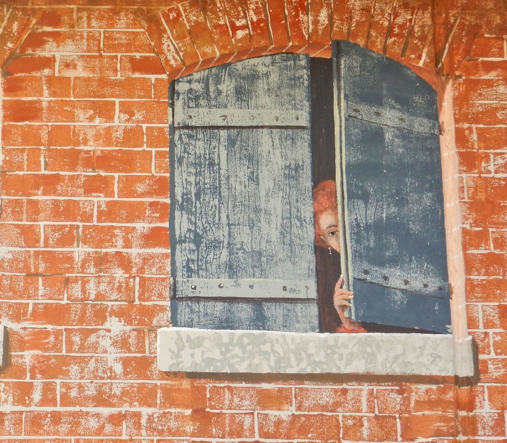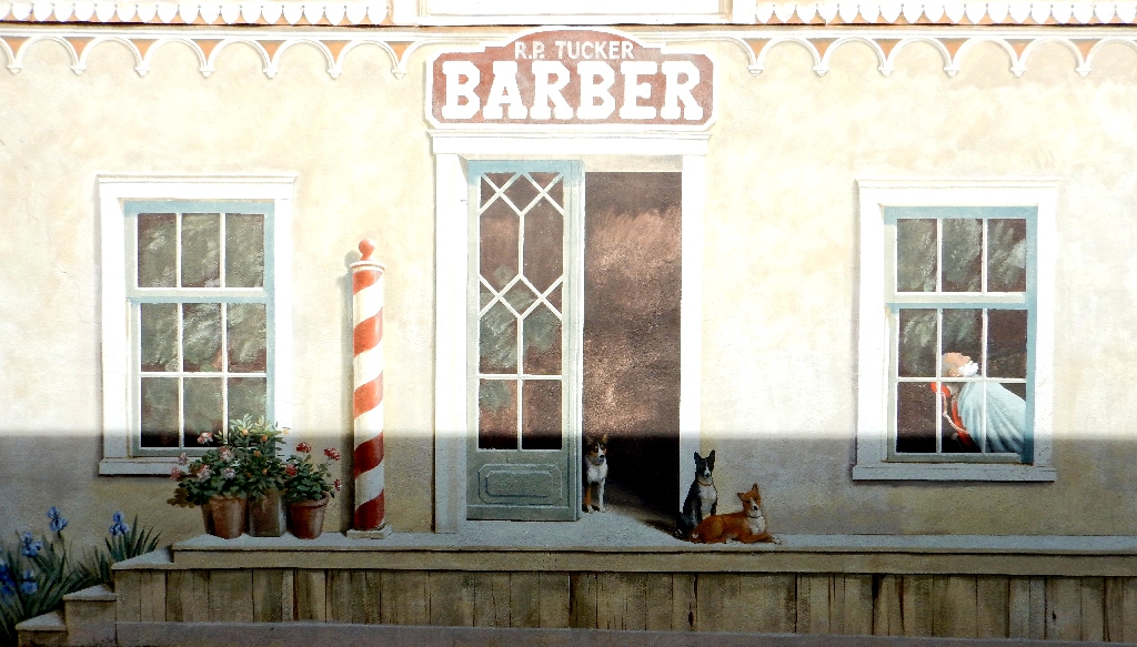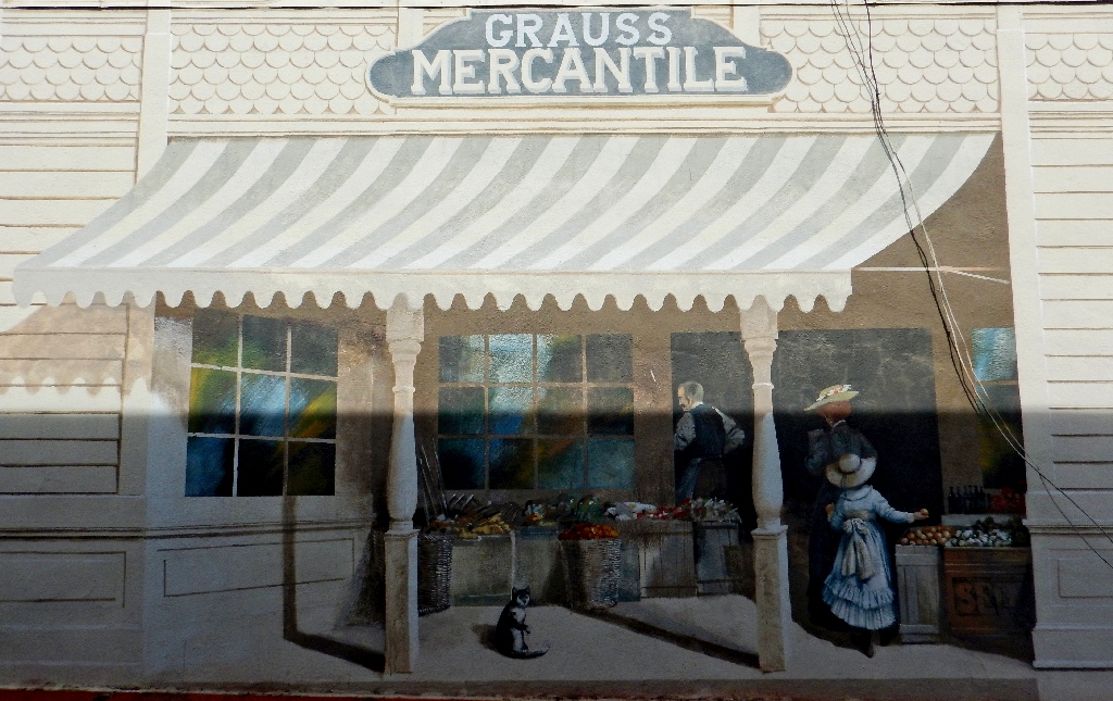On a wall behind the main-street shops