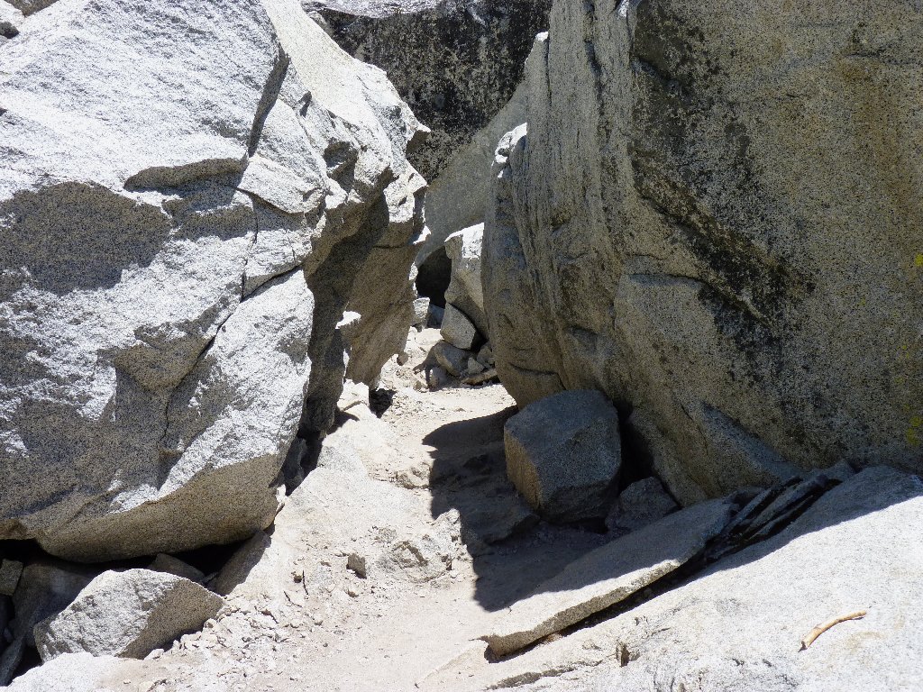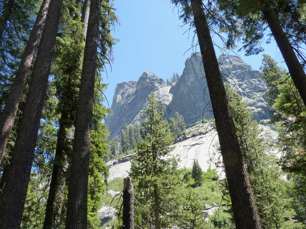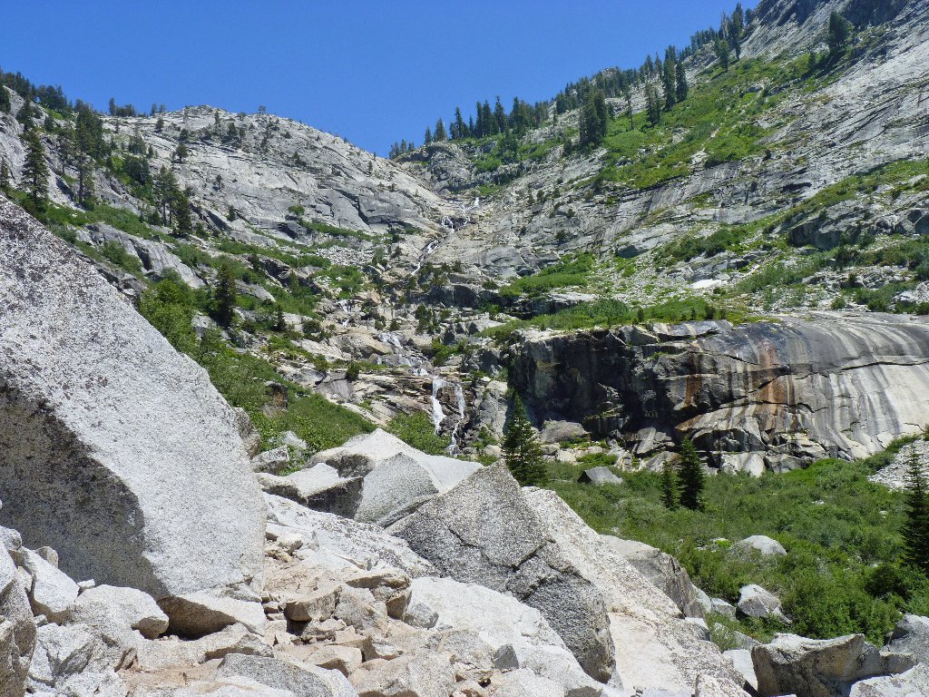 The trail, nice and shady for the first mile, suddenly emerges from the forest into a talus jumble. At the far side of the rock pile, a grand view opens up before me.
