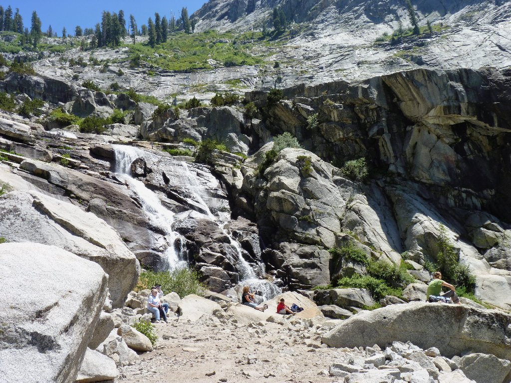 I spot several hikers lounging at trail's end; doubtless they would be sitting in the shade if there were any. Only the lowest section of the falls can be seen from this angle. Admittedly, the views would be nicer at a time of higher water.
