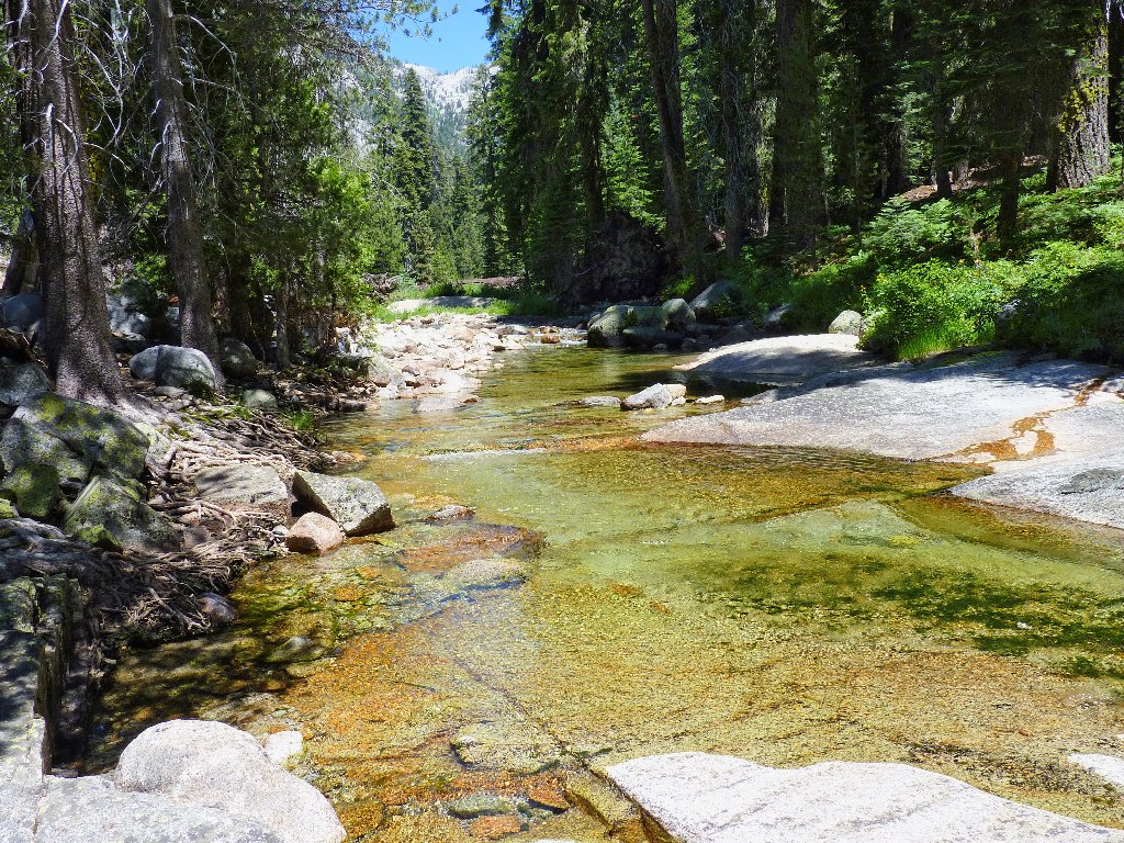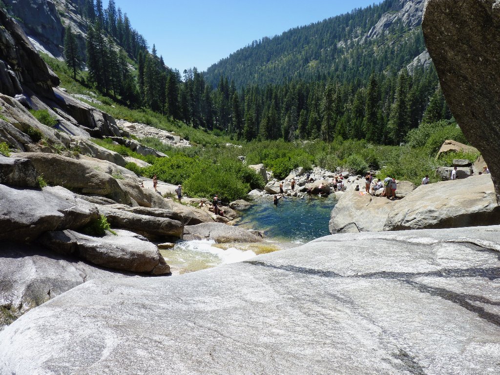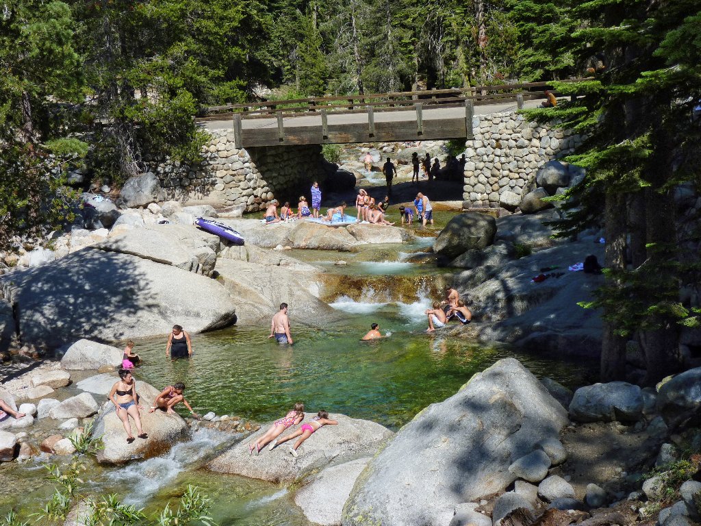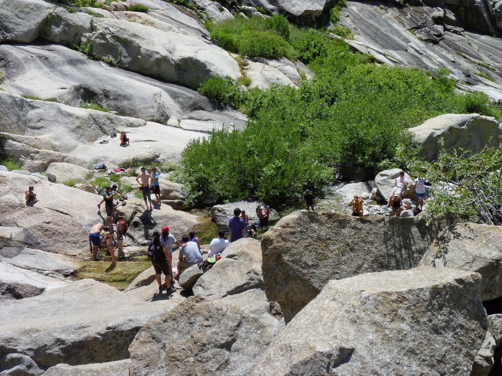 Both upstream and downstream from the trailhead are dozens of sunbathers and swimmers. The ones actually getting wet are finding the water to be pretty cold, because it is only a couple of miles to the snowpack that feeds the stream.