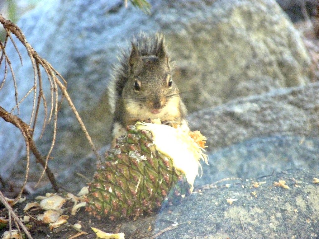 On the return trail, a Britisher is taking flash pictures of a squirrel from