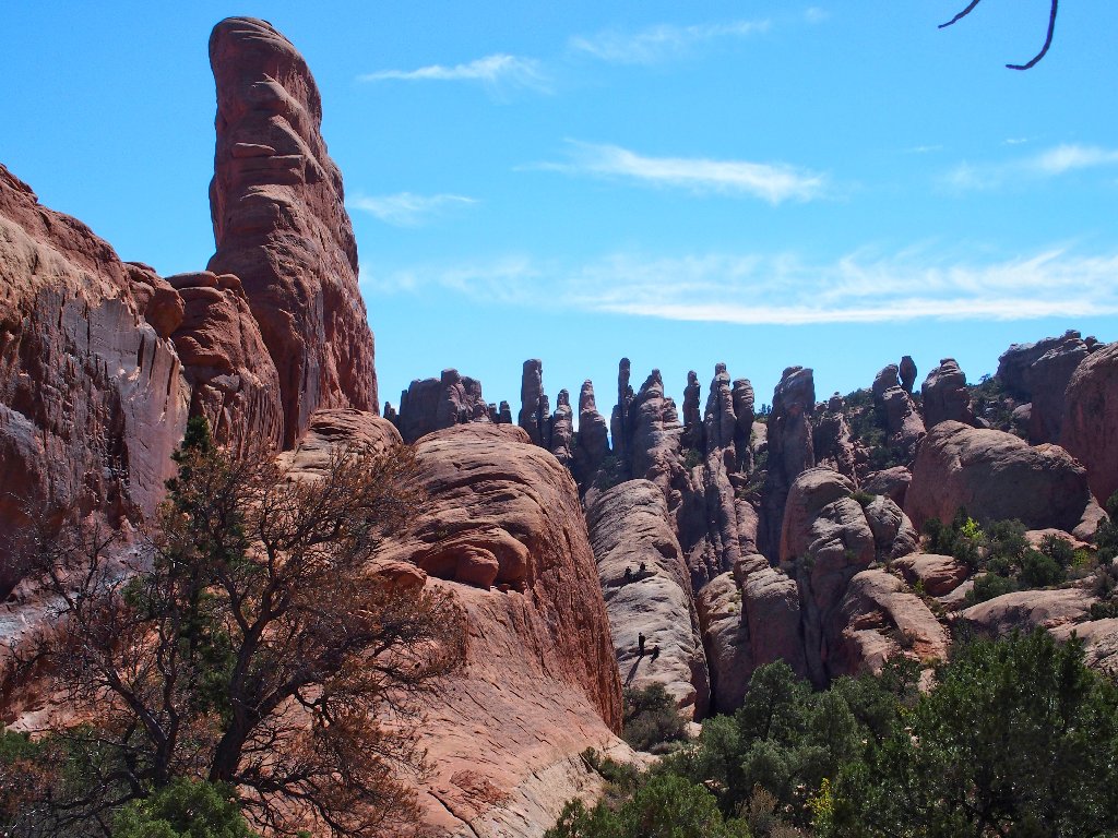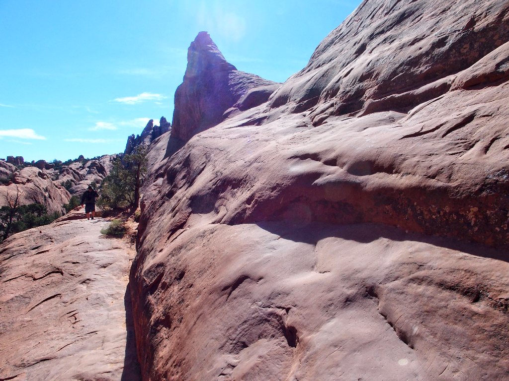 At the on-ramp to the obligatory 'fin-walk', the hiker ahead of me drops his water bottle. I pick it up and hand it to him. Replacing the bottle to its pack, it promptly falls out again. The man already is halfway up onto the fin by now; so this time I throw the bottle up to him, and it manages to stay put.