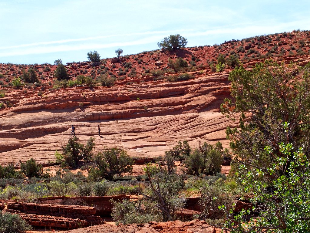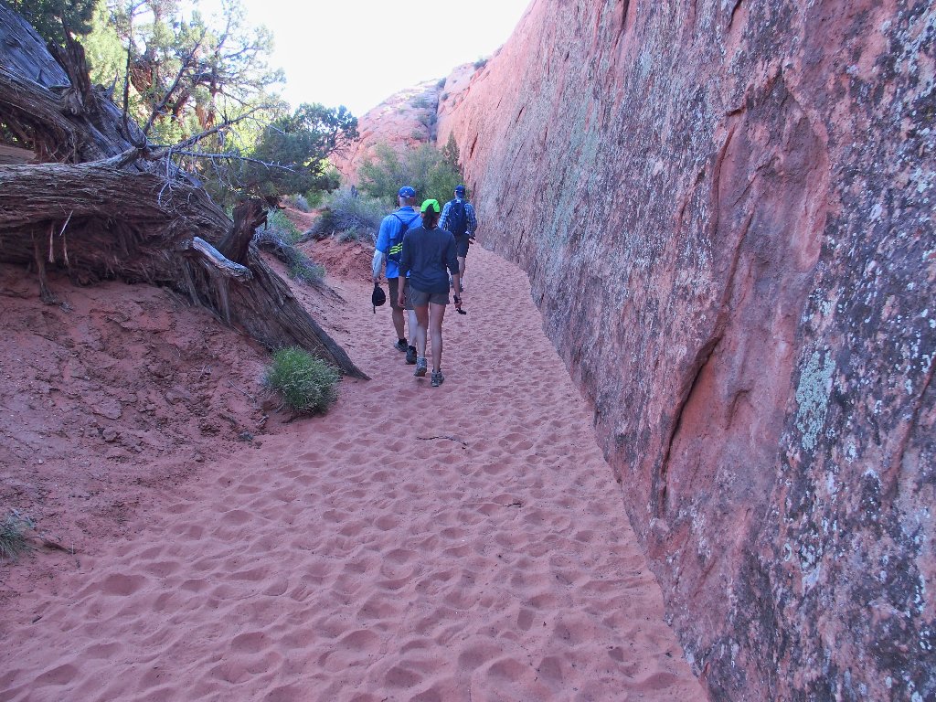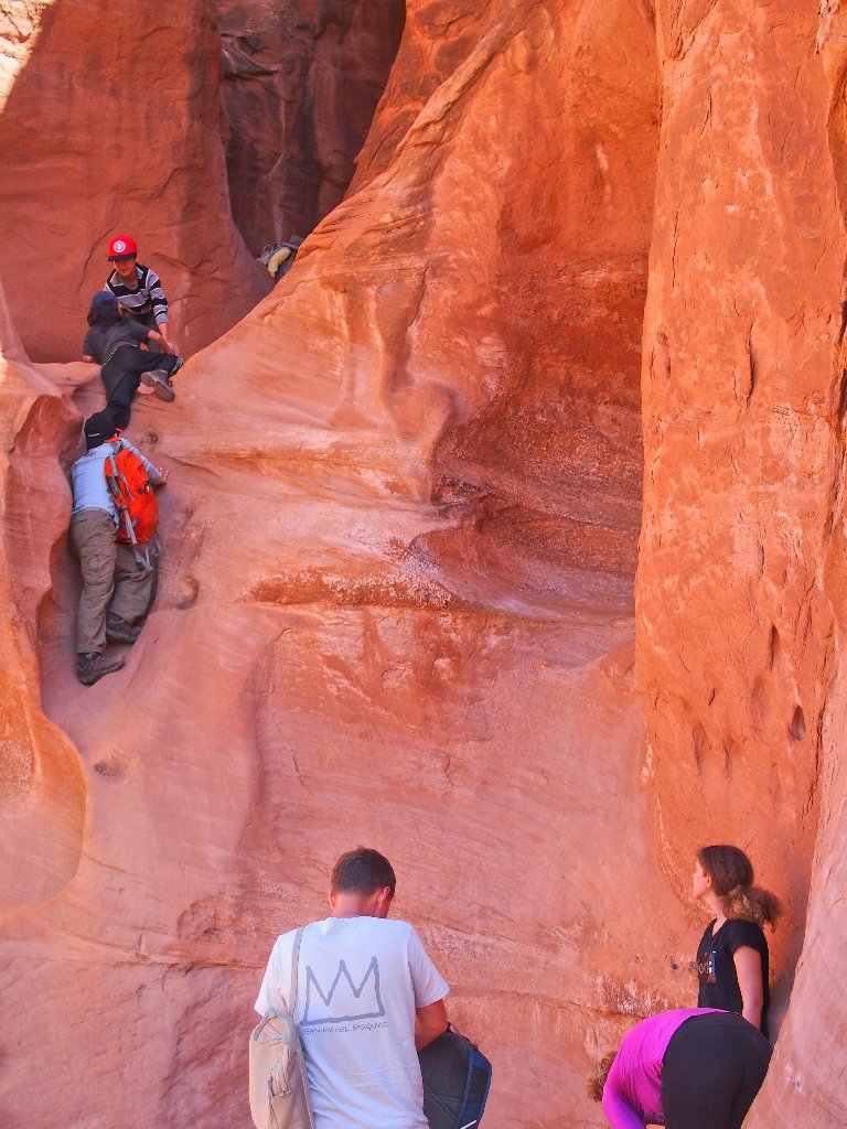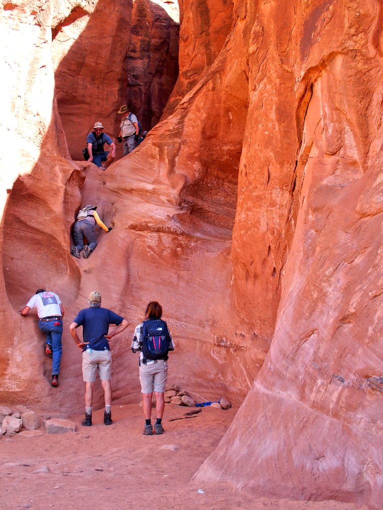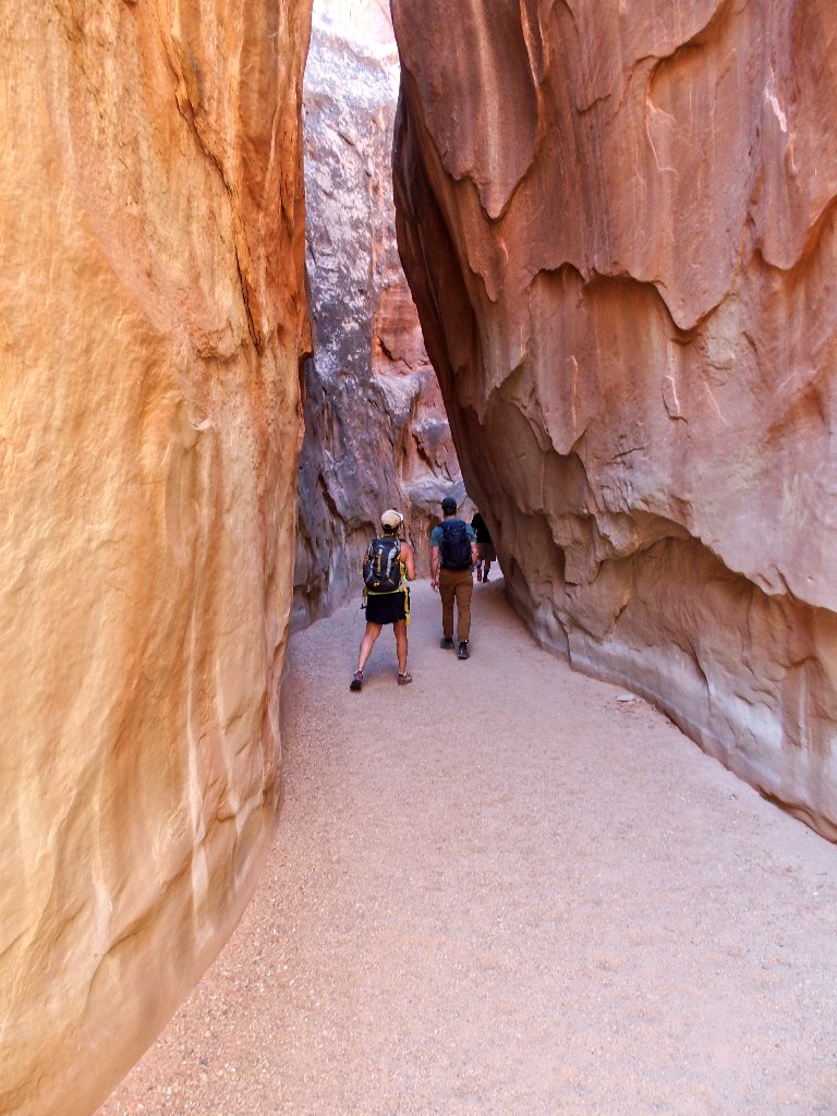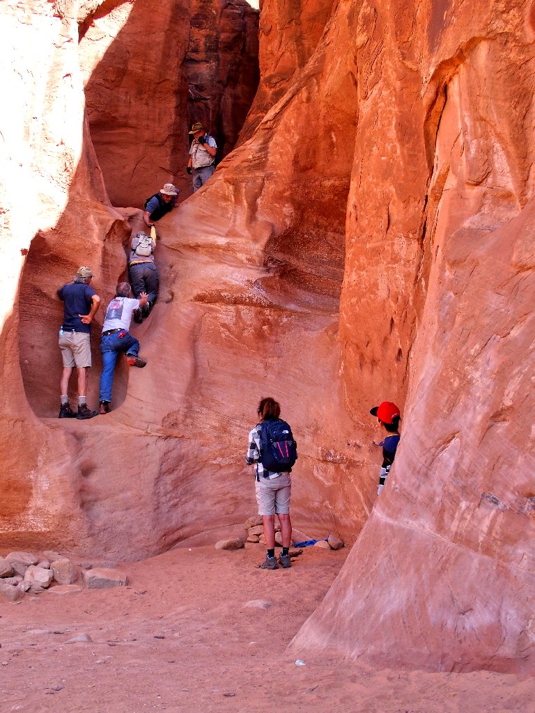 Just as I exit the slot into the sunlight, three hikers reach the bottom of the access trail. The man turns to me and asks where Peekaboo Gulch is. I am going to view some action after all!