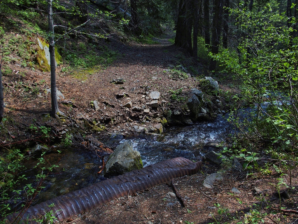 Originally, one bridge crossed the creek and another spanned a diversion ditch. All that remains today is pieces of the foundations.