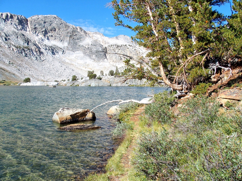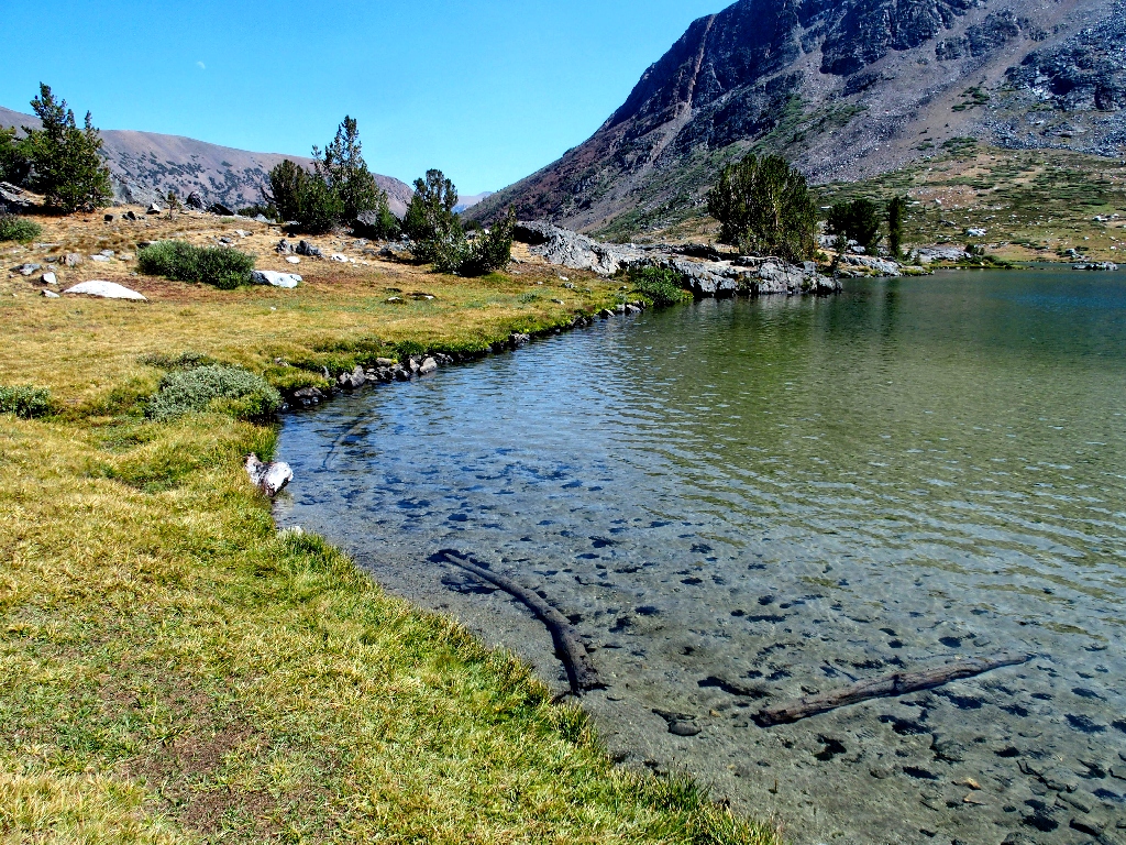 Eventually, a way down to the water does appear, but not until we are well past the end of the lake and it would be well out of the way to detour back.