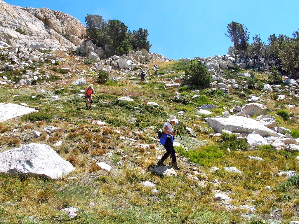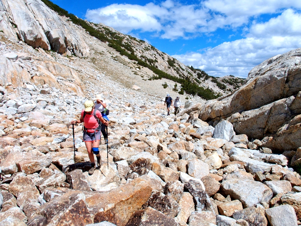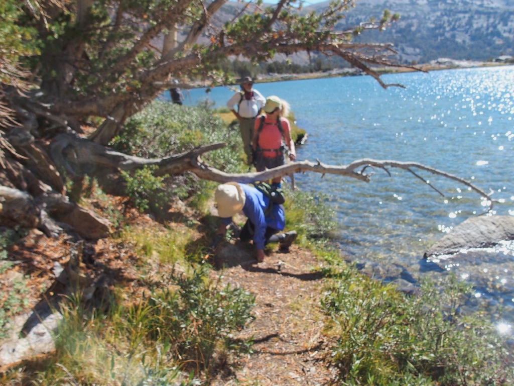 At her turn, Eileen stumbles and falls onto a boulder; fortunately, it is big and flat, so the damage is mininal. In fact, within a couple of minutes, she is back in stride. Although she is even older than I, Eileen is tough.