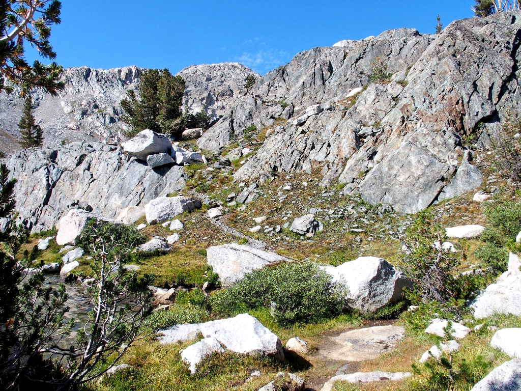 Approaching the falls, we encounter an area of slabs and boulders. It seems that we are supposed to traverse that section and remain near the creek; but inexplicably, I opt to stay on the path that leads around and up the hillside.
