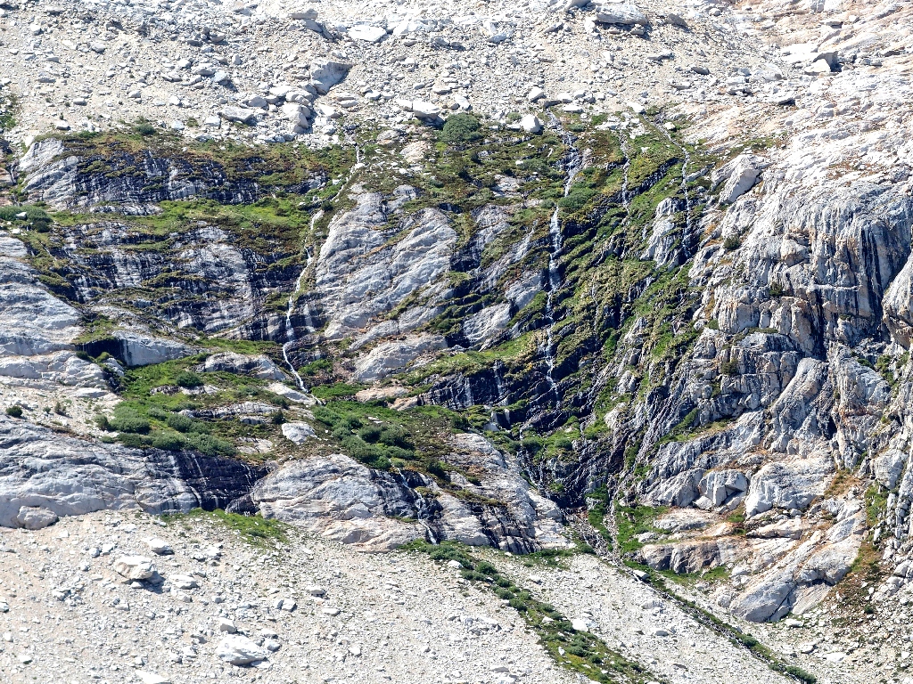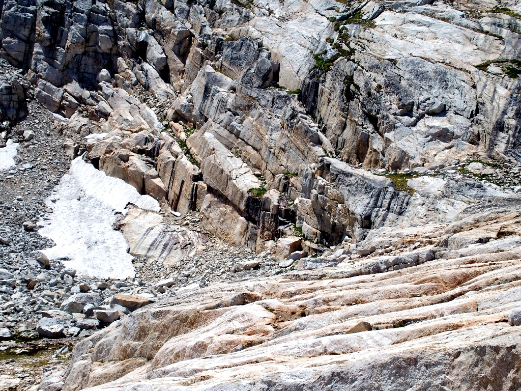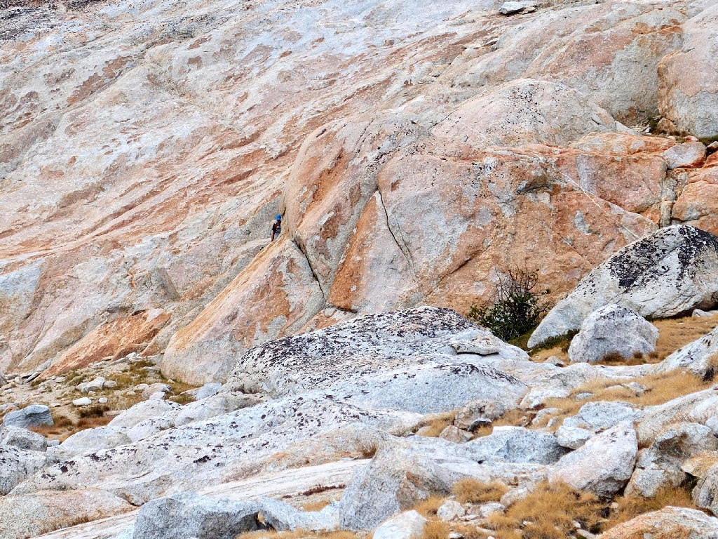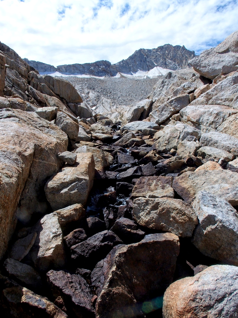 As we ascend a big talus jumble, water is flowing beneath our feet. I find this scramble rather delightful, because there always seems to be a relatively flat boulder to step on.