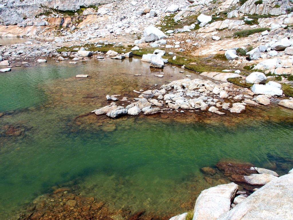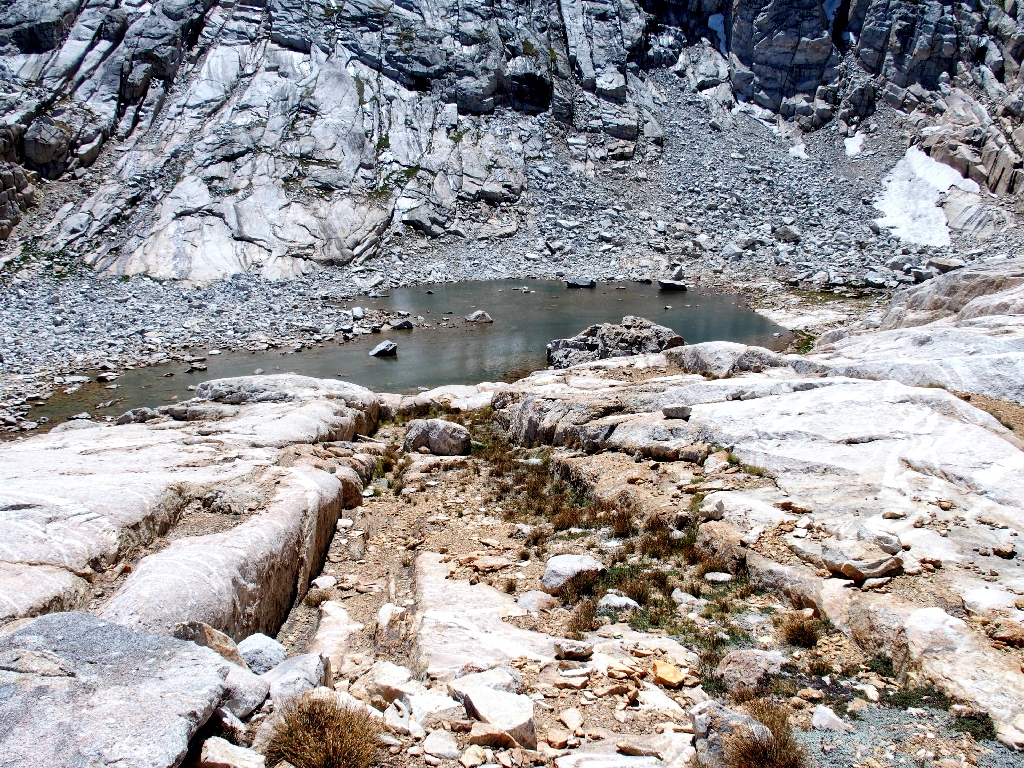 There are many ways to get off of this rock; I opt for one that heads directly toward the little tarn nearest the glacier.