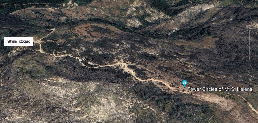 Horrors! After returning home, I discovered that just a short distance from where I turned back is a most unusual formation which is marked on Google Earth as the Power Circles of Mount Saint Helena.