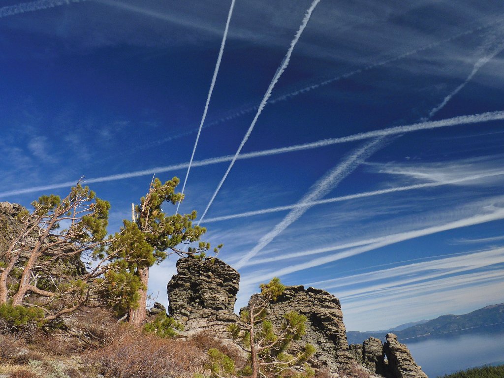 Contrails clutter the sky above Ellis Peak, near Lake Tahoe