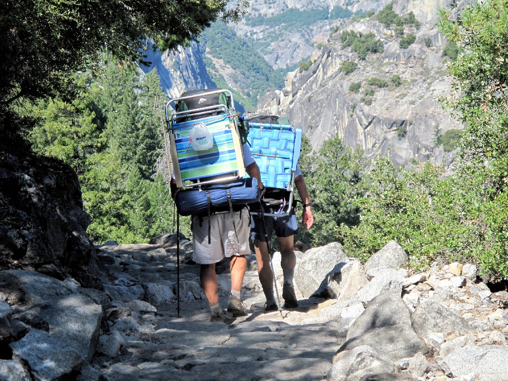 Backpackers with lawn chairs on the John Muir Trail, Yosemite NP